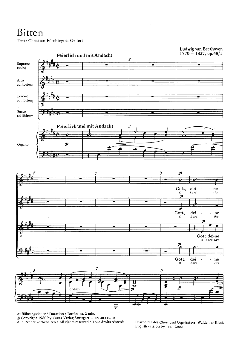 Instrumentation Version 1: coroSATB; Org (orgue); Version 2: VoSoS; Org (orgue); [ (en option); CoroATB (3 stimmig gemischter Chor: Alt, Tenor und Bariton);