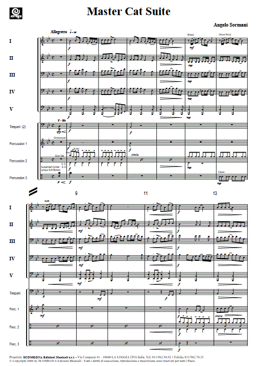 Angelo Sormani a créé cette suite en s'inspirant du « Maître Chat ». Elle dure 12 minutes et reprend les thèmes principaux du conte. Ce morceau fascinant, composé pour 5 voix plus les percussions, peut être également joué par un orchestre au complet ; les résultats obtenus sont excellents. En effet, le CD joint au catalogue contient l'enregistrement réalisé par un orchestre au complet, et, comme vous pourrez le voir, si vous suivez les indications mentionnées sur la partition, le résultat sera surprenant.