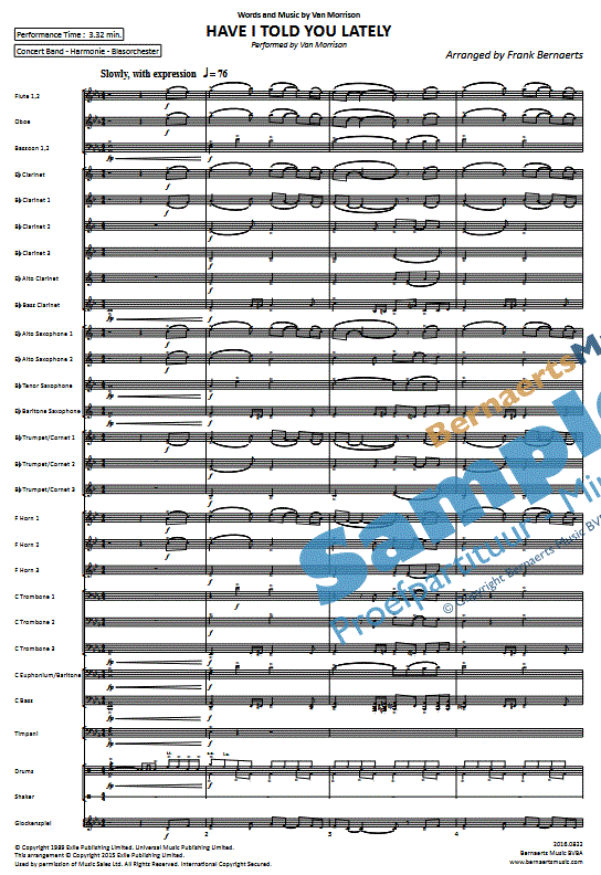Informations complémentaires/contenu « Have I Told You Lately » de Van Morrison reste non seulement une pierre angulaire de la musique populaire, mais elle est également perpétuée dans le monde des orchestres d'harmonie grâce à l'arrangement de Frank Bernaerts. Cette symbiose entre le folk-rock traditionnel et les riches possibilités sonores d'une fanfare permet aux musiciens et aux auditeurs de vivre le message intemporel d'amour et d'affection d'une manière nouvelle. La chanson et son arrangement continueront de ravir et d'inspirer des générations de mélomanes.