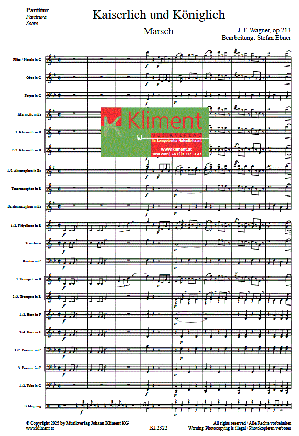 Informations complémentaires/contenu La marche de Joseph Franz Wagner portant le numéro d'opus 213 est une véritable rareté et un chef-d'œuvre redécouvert de la musique de marche autrichienne. Il représente musicalement les deux moitiés de l'empire unies par l'aigle à deux têtes. La partie de marche sonne typiquement autrichienne, tandis que le trio fait plus que clairement référence à la Hongrie, mais le résultat est une marche unifiée avec un attrait sonore particulier.